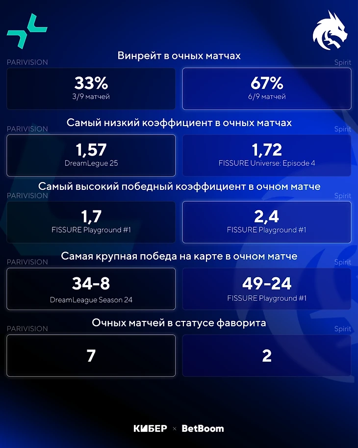 Впервые команды встретились в групповом этапе DreamLeague Season 24. К этому матчу банда Нуна уже считалась фаворитом против нового состава Spirit с Сатаником, Рю и Маликом. На победу PARIVISION букмекеры давали коэффициент 1,66, и пятерка подтвердила силу, одолев соперника со счетом 34-8 на первой карте.