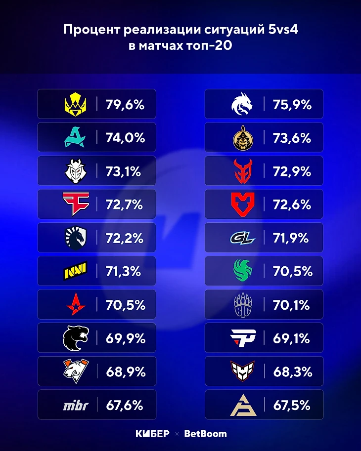 Численное превосходство не гарантирует победу в раунде: даже VItality, которая реализует преимущество лучше всех, делает это только в 80% случаев.