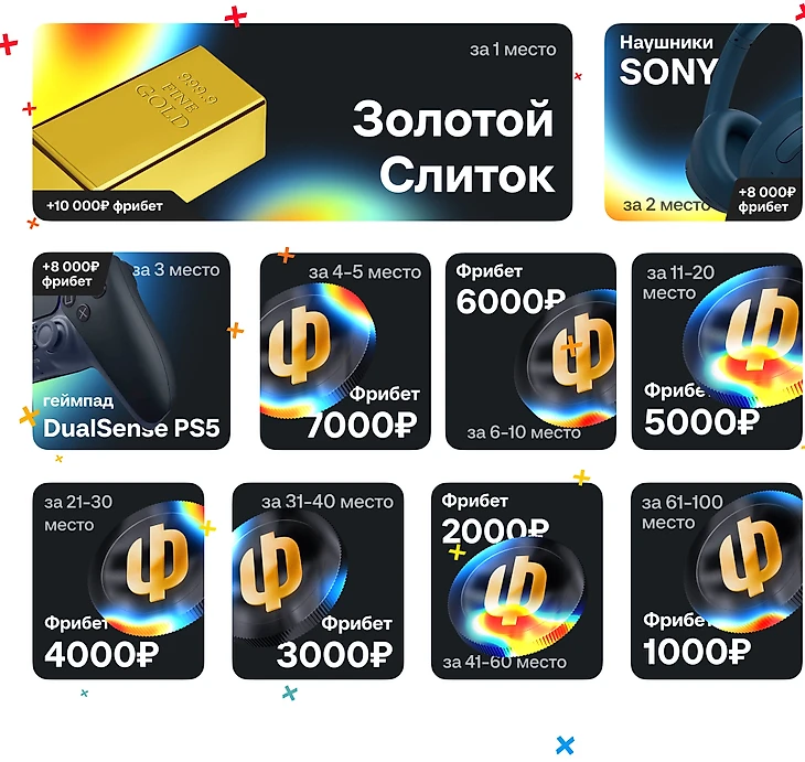1-е место: золотой слиток + фрибет на 10 000 рублей;