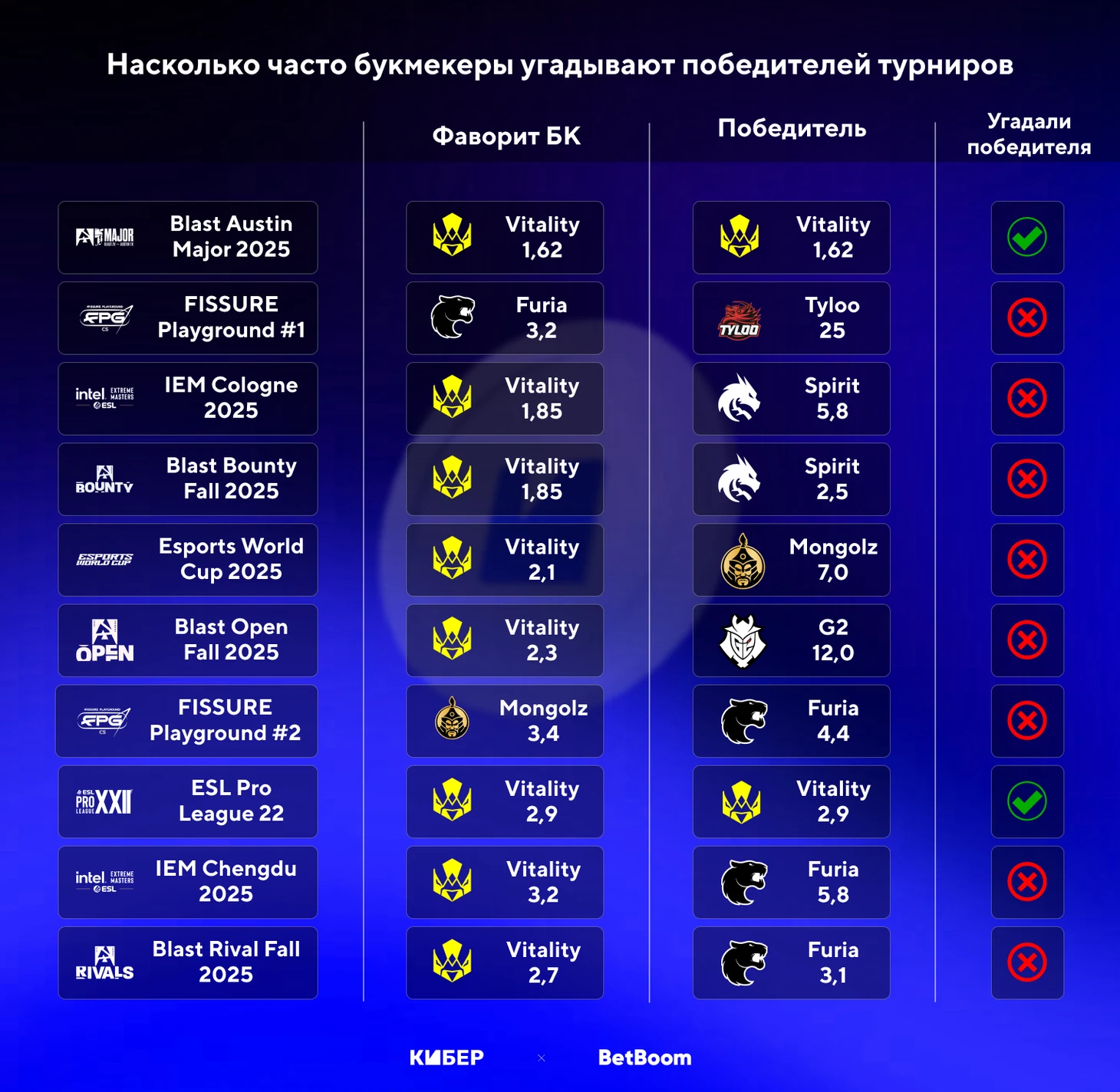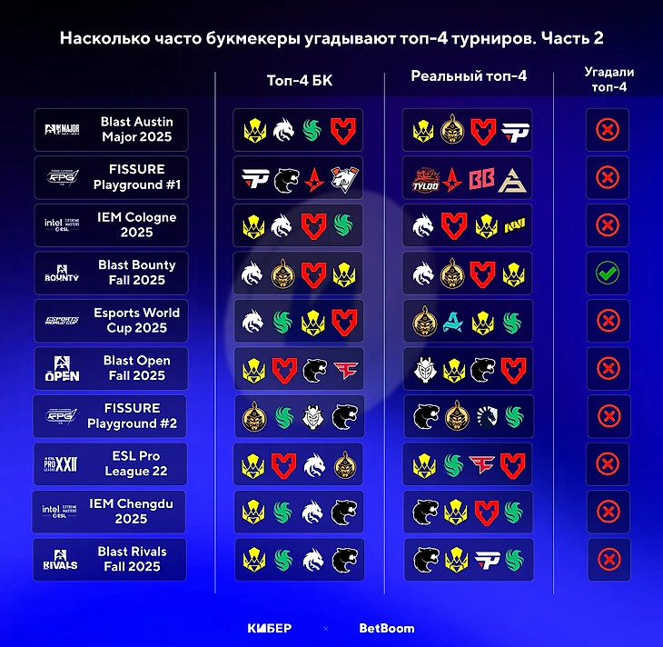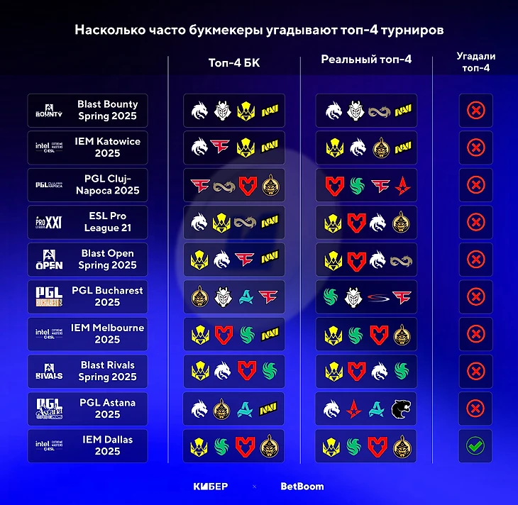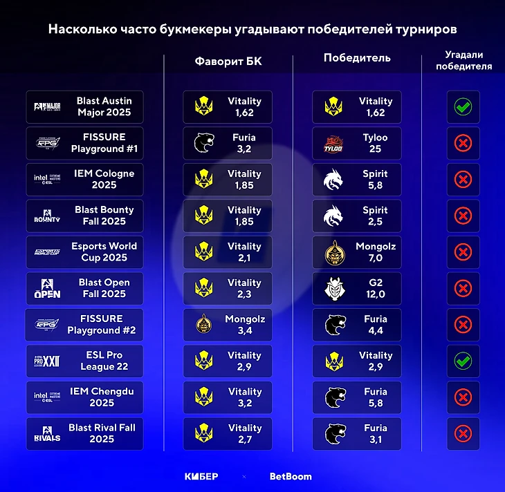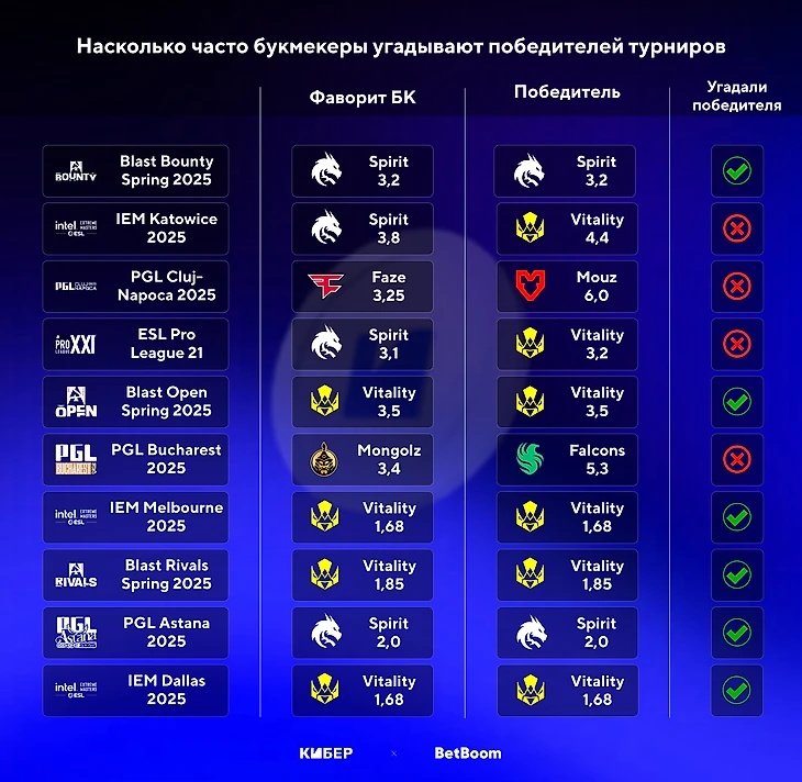 Мы изучили, как часто букмекеры верно угадывали победителей турниров по CS в 2025 году. Спойлер: благодаря доминации Vitality аналитики показали неплохой результат, поэтому мы оценивали их успехи в предсказаниях участников, которые попали в топ-4. Для исследования мы использовали коэффициенты от BetBoom.