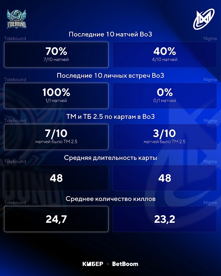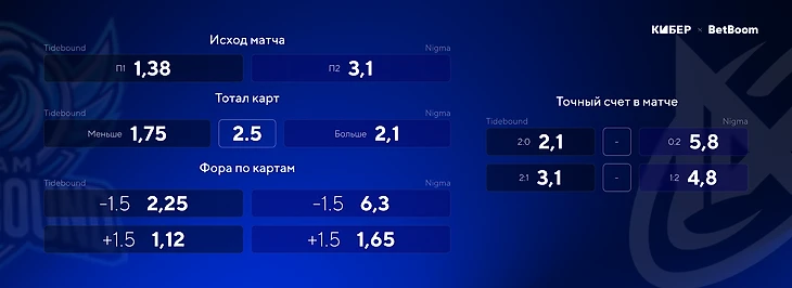 Tidebound по праву считает фаворитом – у команды надежная и стабильная игра. Она умеет реализовывать преимущество в отличие от Nigma. Коэффициент на победу китайского состава не очень привлекает, но можно попробовать фору Tidebound по картам (-1,5) с кэфом 2,25. Риск ощутимо выше, но команда должна уверенно закрывать Nigma.