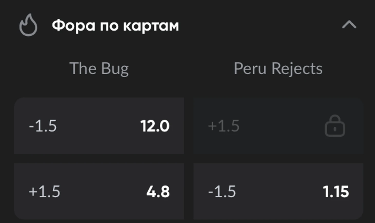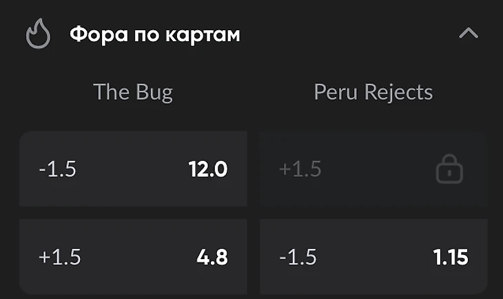 Фора по картам – ставка на разницу побед в матче в пользу одной из команд. Одна карта = одно очко, поэтому даже проигрыш одной карты может испортить ставку на фору. Примеры: (-1.5) и (+1.5). Фора -1.5 означает, что команда должна выиграть матч с разницей не менее 2 карт; фора +1.5 — что команда уступит с разницей не более 1 карты или выиграет.