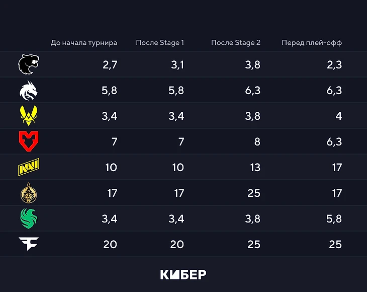 Mouz – единственная команда, кроме Furia, коэффициент на победу которой упал по сравнению с предтурнирными раскладами. Чемпионат для пятерки начался с очень сложного матча против PARIVISION: команда отыгралась с 10:12, а затем вырвала победу в овертайме 16:14. После этого были поражение от Spirit и трудовая победа над Falcons. Относительно легкой получилась только игра против B8. Этого хватило букмекерам, чтобы снизить итоговый коэффициент до 6,3.