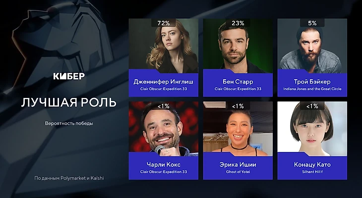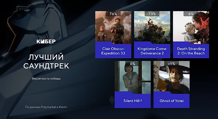 Кажется, в этой номинации обойдется без сюрпризов: на Polymarket и Kalshi Clair Obscur: Expedition 33 лидирует с огромным отрывом. За нее проголосовало более 90% пользователей.