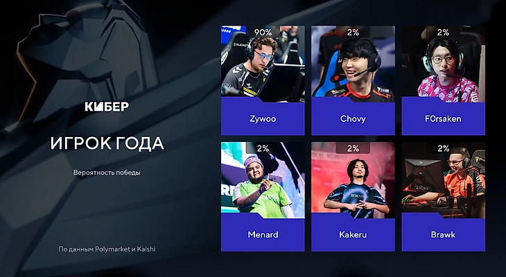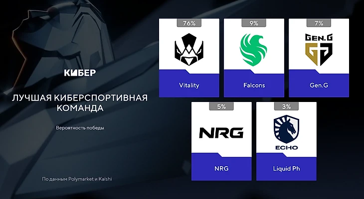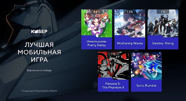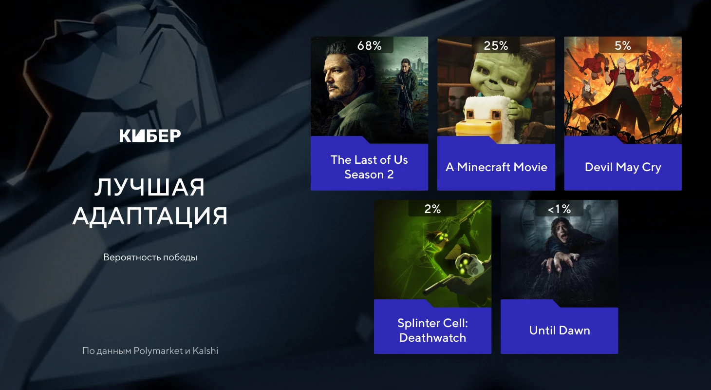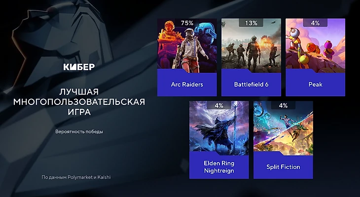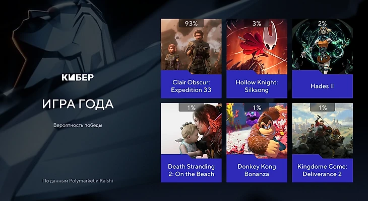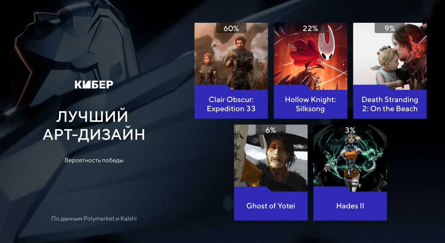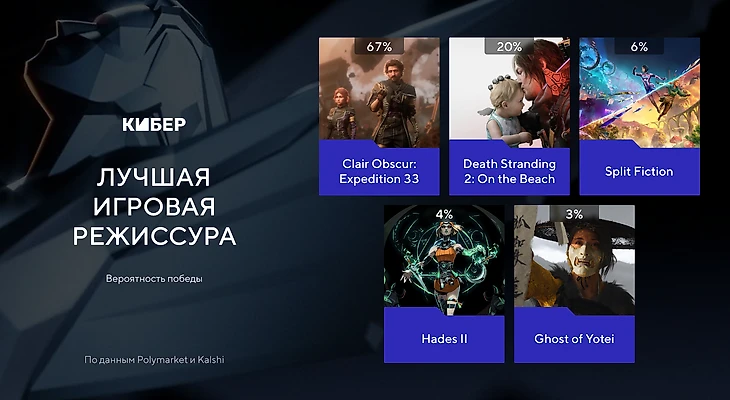 В России обе платформы нелегальны, поэтому ставить на них нельзя, но они помогут определить фаворитов премии. По сути, вероятность победы той или иной игры на Polymarket и Kalshi – это альтернативное голосование, ведь вероятность на этих платформах показывает, какое количество пользователей проголосовало за выбранный исход.