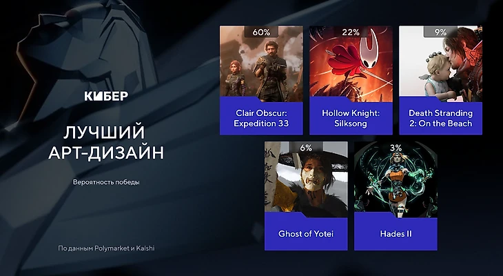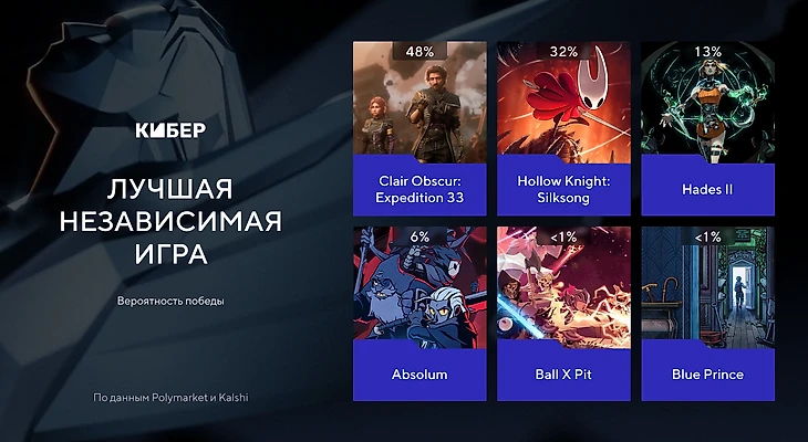 Здесь также лидирует Clair Obscur: Expedition 33. Ее выбрали больше 50% пользователей бирж прогнозов. Побороться с ней может только Hollow Knight: Silksong, на нее поставили около 35% пользователей.
