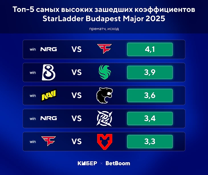Здорово, что оба неожиданных результата из плей-офф попали в топ-5 самых высоких кэфов. Мйджор в Будапеште запомнится не только как очередной этап в доминации Vitality, но и турнир, где Faze подарила сказку, а B1ad3 доказал, что его рано списывать со счетов.