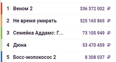 Фильм собрал 336 млн рублей (общий заработок в России – 1,6 млрд рублей) и обошел новый фильм бондианы «Не время умирать» с Дэниелом Крейгом, который стартовал с 325 млн рублей.