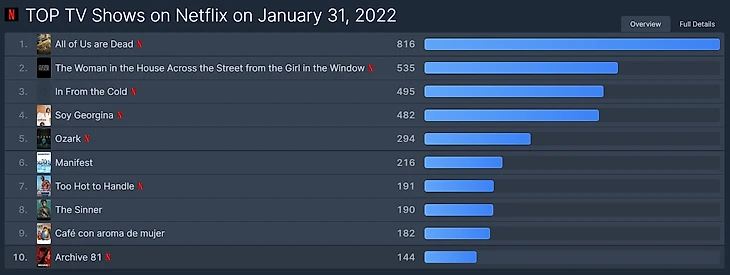 Премьера зомби-хоррора состоялась 29 января, уже 30-го числа сериал возглавил топ Netflix в мире. В российском топе «Мы все мертвы» занимают 2-е место, уступая триллеру «Женщина в доме напротив девушки в окне».