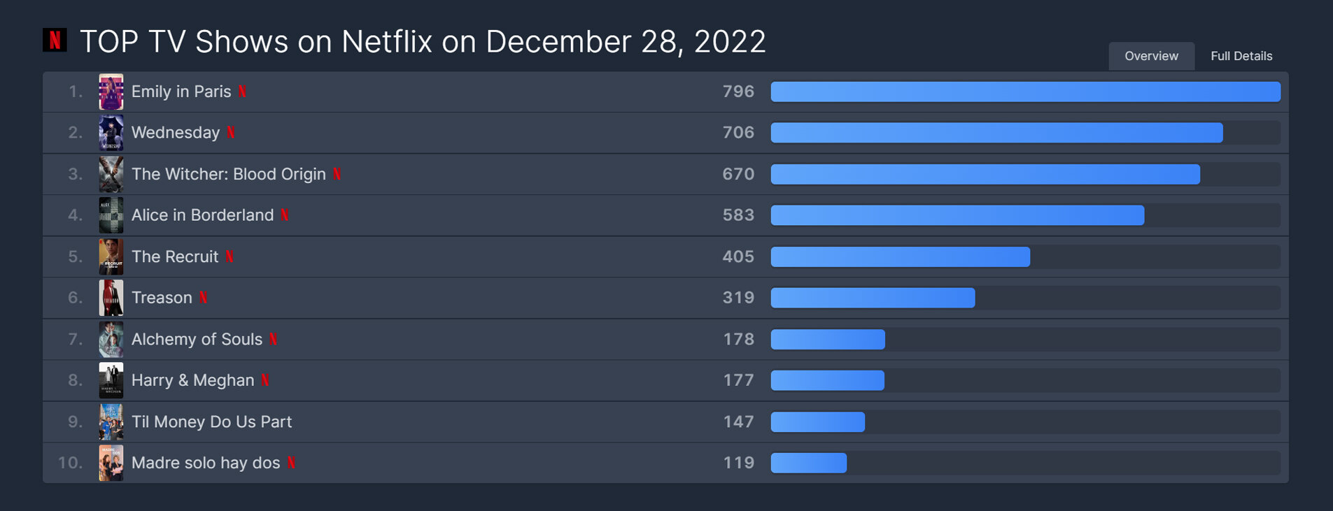Сериал «Уэнсдэй» опустился на вторую строчку списка самых популярных шоу Netflix. Первенство перехватил новый сезон «Эмили в Париже». Именно такие данные дает портал FlixPatrol, отслеживающий статистику крупнейших киносервисов.