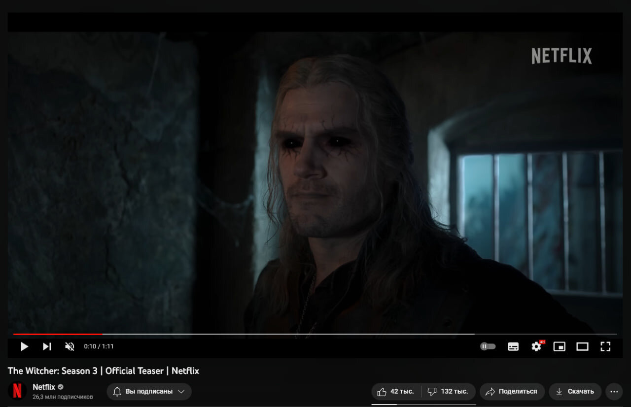 Трейлер третьего сезона сериала «Ведьмак» набрал более 130 тысяч дизлайков за сутки
