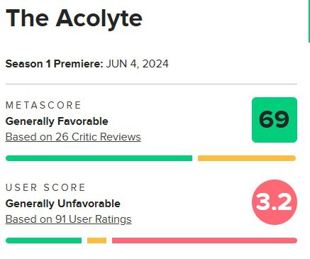 Сериал «Аколит» по «Звездным войнам» получил 3,2 балла от зрителей и 69 баллов от критиков на Metacritic