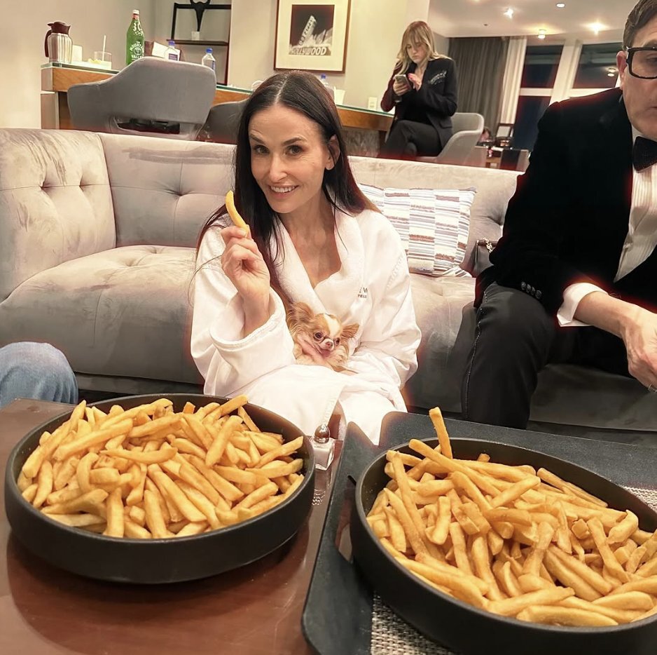 В сети появилось фото, где Деми Мур проводит конец ночи «Оскара» за столом с двумя подносами картошки фри и своей собакой породы чихуахуа Пилафом.