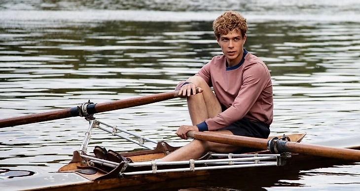 «Первый на Олимпе» рассказывает о двукратном олимпийском чемпионе по академической гребле Юрии Тюкалове. Продюсер фильма Андрей Тартаков отмечал, что цель съемочной команды – добиться сочетания эффектно снятого соревновательного процесса и постараться рассказать зрителю историю, которая построена на преодолении героем самого себя.