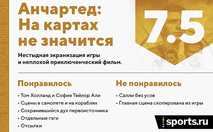 Другая большая победа «Анчартеда» – в том, что это хороший фильм и для людей, совершенно не знакомых с играми. То есть можно прийти на сеанс, не зная всех этих людей, и хорошо провести время. Лучше, чем, скажем, за просмотром последней «Лары Крофт». Здесь хватает умеренно смешных шуток и ярких экшен-сцен. Атлетичный Холланд смотрится в типичных для Дрейка ситуациях даже органичнее, чем оригинальная версия протагониста. Ну а безумный третий акт на летающих кораблях получился достойным даже топовых летних блокбастеров – для игровых экранизаций это высшая похвала.