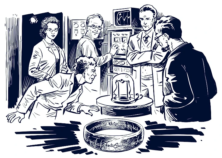 Кольцо рассказывало ученым о войне людей, коротышей и гоблинов, а те в интермедиях пытались объяснить события с научной точки зрения. Например, камень Палантир – это «нечто вроде видеотелефона или телевизора», врата Мории – «реле, настроенное на биотоки», а огненный жезл Гэндальфа – это «разрядник, искровой или коронного типа».