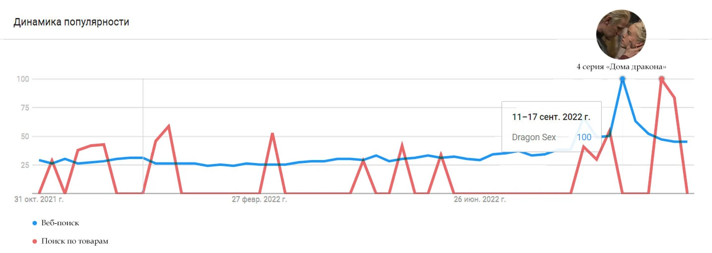 Может, зрители просто хотят больше узнать о размножении драконов? Не совсем: спустя две недели, 2-8 октября, наблюдалась максимальная популярность запроса «dragon sex» среди товаров. На той неделе вышел 7-й эпизод «Дома дракона», в котором Эймонд эффектно приручил гигантскую драконицу Вхагар.