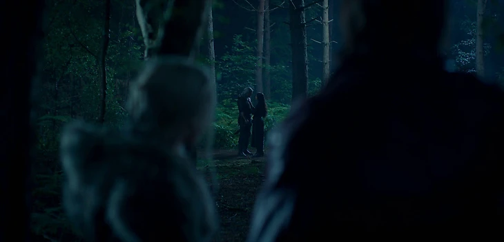 Например, в 4-й серии показали личный разговор Геральта и Йен, который закончился поцелуем (важный момент, ведь они долго держались на расстоянии). Это подали не как мелодраматическую сцену: мы видим разговор от лица подсматривающего Лютика, который подшучивает, имитируя их речь. Все, чтобы рассмешить Цири, которая тоже втягивается в игру и уже передразнивает хрипотцу Геральта. Получилось не саркастично, а естественно и с любовью к паре – такой подход делает сериал живее и разбавляет привычные диалоги.