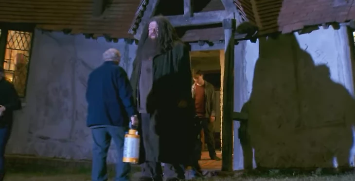 Для съемок использовались две версии хижины Хагрида. В одной из них находился реквизит больших размеров – на его фоне персонажи со стандартным ростом выглядят пропорционально меньше. В другой хижине использовался реквизит уменьшенных размеров. Там Колтрейн снимался отдельно, а его тело казалось огромным в сравнении с любыми предметами.