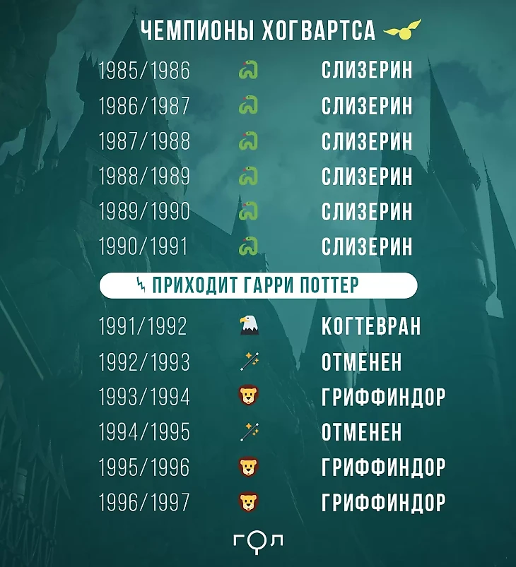 Поттер сразу перевернул игру. В первом же матче он обыграл Слизерин, поймав снитч ртом, а не руками. Но дальше Роулинг поступила оригинальнее. В тот сезон Гриффиндор не победил. Точный чемпион не называется, но, вероятно, кубок взял Когтевран, который разгромно выиграл последнюю игру. Гриффиндор при Гарри Поттере стал чемпионом только с третьей попытки.