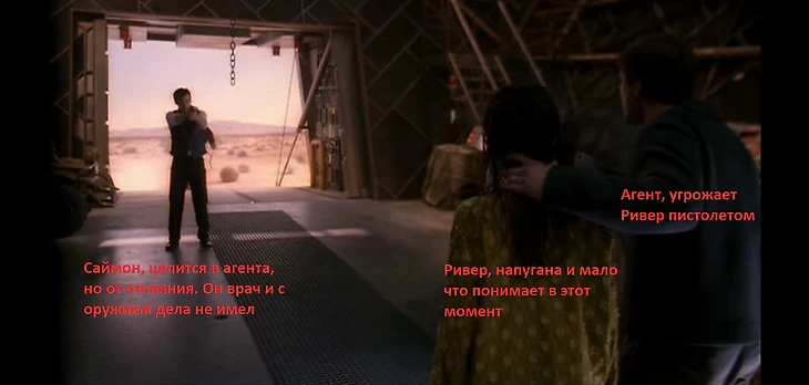 Мэл колеблется: с одной стороны ему не нужны проблемы с законом, а с другой - брат с сестрой виноваты только в том, что сбежали. Точнее Саймон помог сбежать своей сестре из места, где над ней чуть ли не эксперименты ставили. И капитан решает временно подвесить «проблему», пока не разберётся с текущим заказом по доставке груза. Он вместе с Джейном и Зои отправляется на встречу, а в это время агент выбирается из заключения (ну Мэл его временно запер в каюте, чтобы не рыпался) и хочет увести Ривер (Саймон ему не нужен, ценна только девушка, тк обладает какими-то сверхспособностями). Саймон пытается отбить сестру, но не очень успешно. И в какой-то момент мизансцена следующая:
