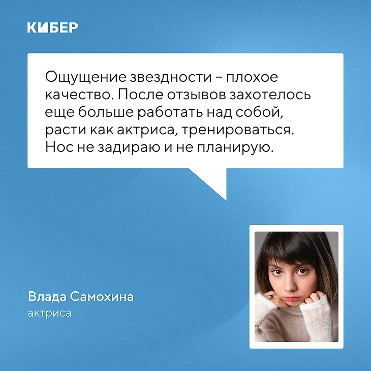 – Нет, на улицах меня не узнают. Да и ощущение звездности – плохое качество. После отзывов захотелось еще больше работать над собой, расти как актриса, тренироваться. Нос не задираю и не планирую.