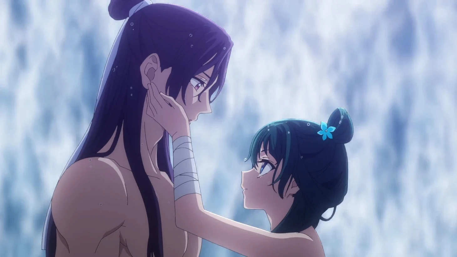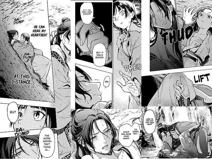 На первый взгляд, сцена с лягушкой кажется забавным недоразумением, но на деле она куда значительнее. В пещере Маомао случайно падает на Дзиньси, оказавшись с ним в неожиданно близкой позе. В суматохе она что-то ощущает у него на коленях и, как обычно, без лишних эмоций решает, что это лягушка. Реальность, конечно, гораздо более неловкая. Этот эпизод — один из самых ярких моментов физической близости между героями, подчеркивающий их растущее влечение, которое уже невозможно игнорировать.