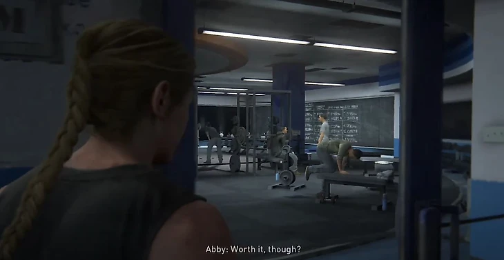 ● В начале истории мы должны воспринимать Эбби как полную противоположность Элли. И, что важно, не испытывать к ней симпатии: это чувство формируется как раз через разницу во внешности. Огромная, перекачанная, необоснованно жестокая и абсолютно непривлекательная девушка против худенькой, беззащитной девочки-пацанки.