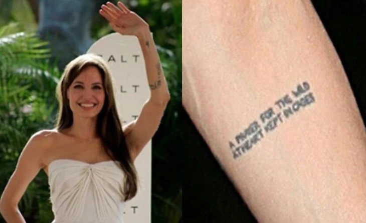На правом предплечье у актрисы арабская вязь – надпись, означающая в переводе «решимость» или «силу духа». Когда она была замужем за Билли Бобом Торнтоном,, супруг придумал определенный геометрический символ, который Джоли нанесла на предплечье. Но после развода символ исчез и появилась надпись.