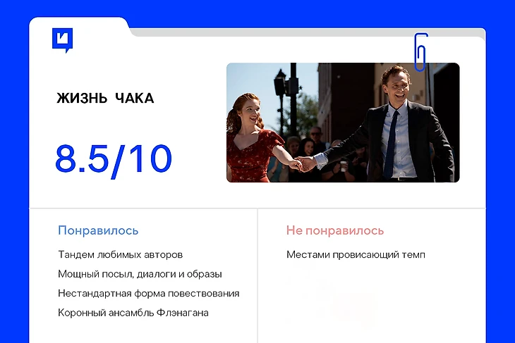 И уже своим закулисьем «Жизнь Чака» интересен, как кейс. Что это за уважительно следующее каждой букве оригинальной прозы кино с шансами на лавры «Оскара» с «Золотым Глобусом», и в чем его маленькая теплящаяся магия – рассказываю в своем обзоре.