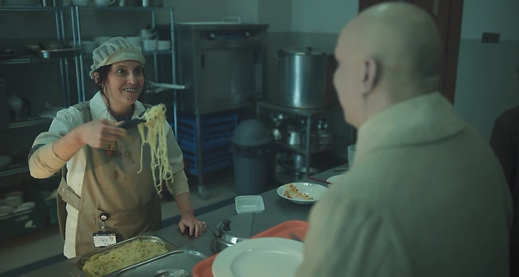 Уэнсдей просматривает камеры и замечает странную женщину. Она выглядит обычно, но сидит в самой охраняемой камере.