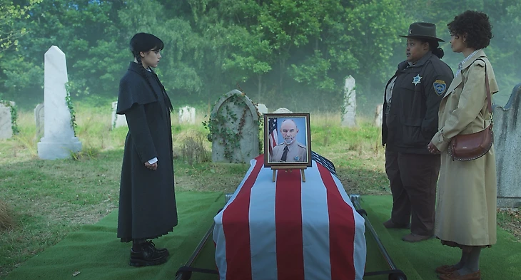Тогда и появляется бабушка Уэнсдей. Она приносит документы на кладбище, которое оформила на имя внучки. Уэнсдей узнает, что подпись принадлежит Августу Стоунхерсту, и уходит на поиски информации.