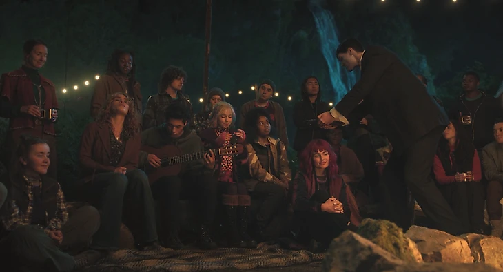 У костра Дорт продолжает попытки привлечь мать Мортиши к участию в комитете. В то же время Энид наконец объясняется с Эйджаксом и признается, что чувства изменились за лето. Они больше не могут быть вместе, и он уходит с разбитым сердцем. Кадеты в камуфляже готовятся к атаке.