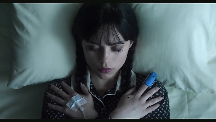 Она переносится на кладбище, где ворона с белой розой сидит на надгробии Энид. В этом видении окровавленная Энид душит Уэнсдей и обвиняет ее в своей смерти. В реальности Уэнсдей падает, корчится в судорогах и плачет черными слезами. Мортиша и Энид пытаются ей помочь.