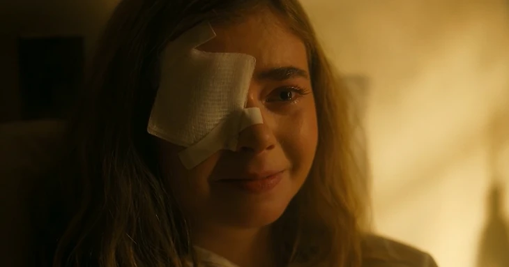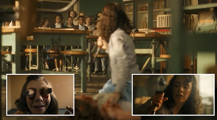 ● Пеннивайз помешает Мардж в ведение, где из ее глаз глаз выползают огромные паразиты. Девочка, пытаясь вырезать их стамеской, выкалывает себе один глаз – Лилли успевает спасти подругу от галлюцинаций и забрать инструмент. Но в этот момент в класс вбегает толпа детей – все видят окровавленную Мардж и Лилли с оружием в руках…
