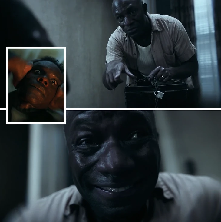 Дед входит в ванную с ящиком под замком – говорит, что его нельзя от него спрятать и требует открыть ящик. Холлоран отказывается, после чего дедушка стреляет в ногу бабушке, искривляется в улыбке Пеннивайза и сам открывает ящик – Дик хватается за голову от ужаса.