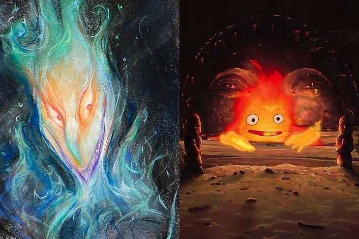 В аниме Кальцифер действует иначе и выглядит как оранжево-желтый огненный шар. Он вполне дружелюбен с первых сцен, и со временем отношение к Софи теплеет еще больше. Он мягко ворчит, много шутит, помогает по дому и напоминает скорее какого-нибудь домового, чем демона.