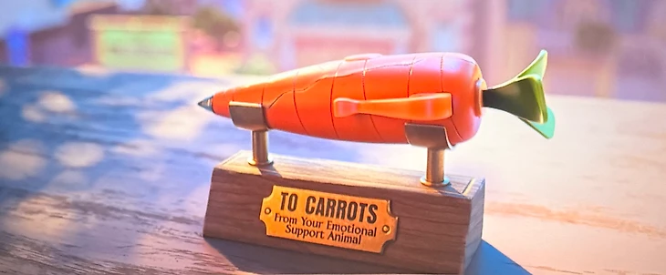 Крольчиха возвращается в квартиру, держа в руках ручку в форме морковки (которая сыграла важную роль в обоих фильмах). Изначально она отдала ее Нику в честь первого совместного раскрытия дела. В конце фильма лис возвращает Джуди ручку с трогательным аудио-посланием: «Люблю тебя, напарник».