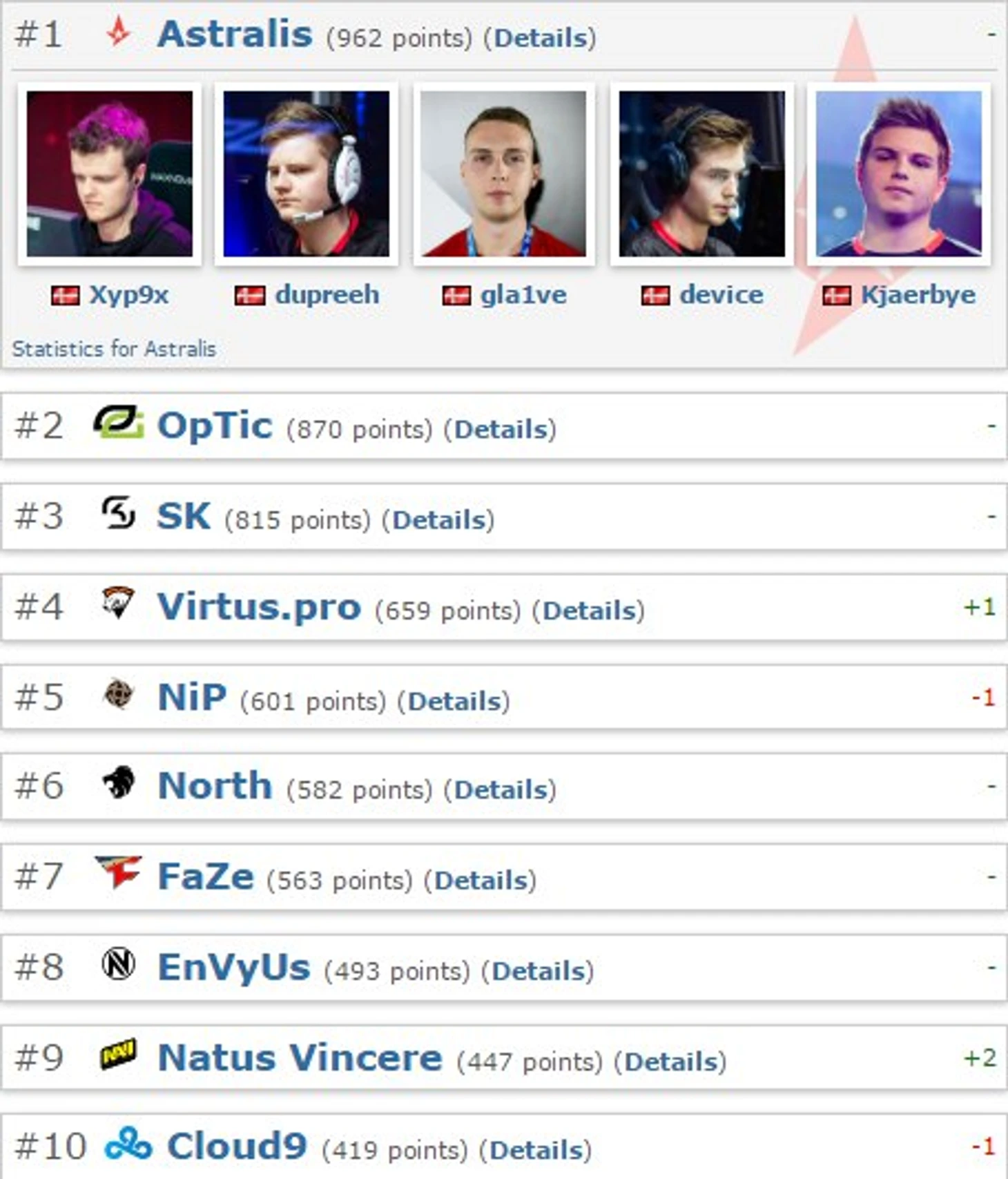 В верхней части изменений не произошло: лидируют Astralis, OpTic Gaming и SK Gaming.