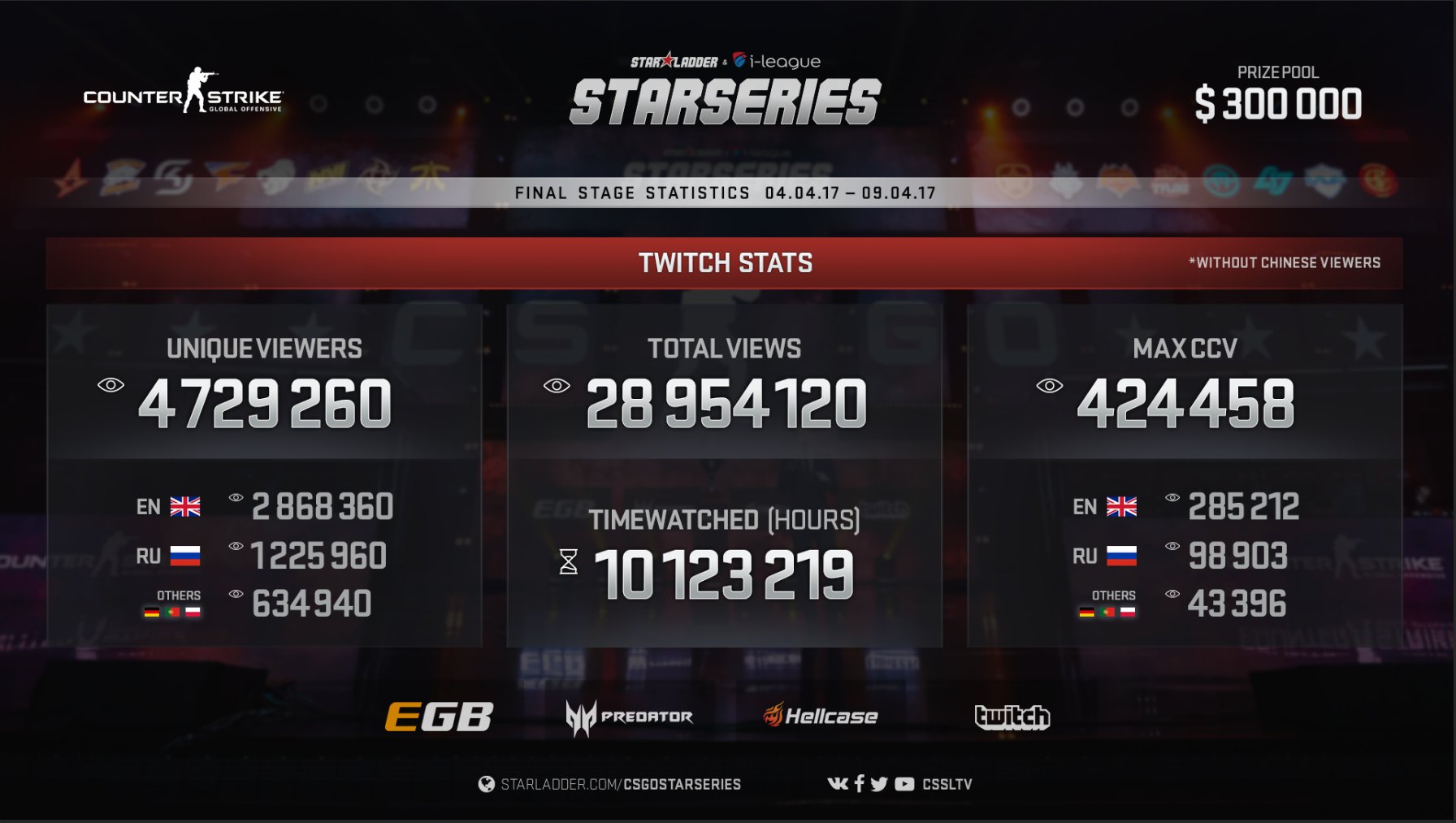 Студия StarLadder представила статистику просмотров турнира SL I-League StarSeries Season 3 по CS:GO. Всего турнир посмотрело 4,7 миллионов уникальных зрителей, а общее количество просмотров составило 29 миллионов зрителей. Максимальное количество зрителей во время матча составило 424 тысячи зрителей, из которых 285 тысяч на английской трансляции, что является рекордным показателем для студии.