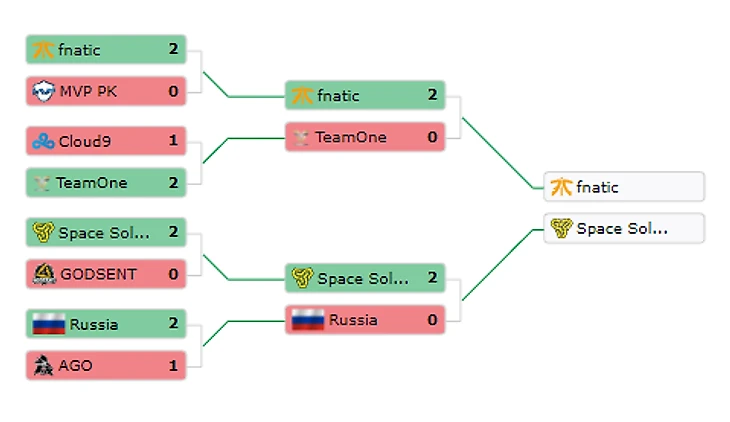 10:00 Fnatic (Швеция) 2-0 Team One (Бразилия)12:30 Space Soldiers (Турция) 2-0 Team Russia (Россия)