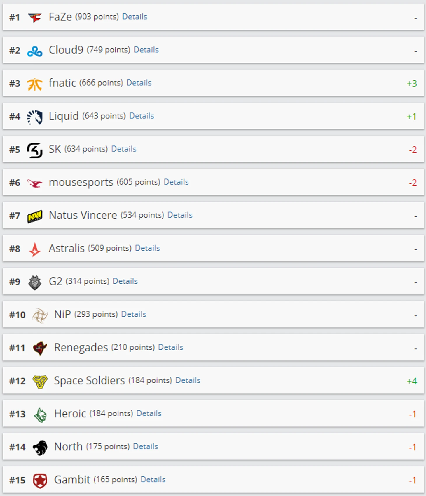 SK Gaming опустилась на 2 позиции и теперь находится на пятой строчке рейтинга. Впервые за последние два года бразильский состав упал за пределы топ-4. На две позиции также опустилась Mousesports. Теперь команда занимает шестое место.
