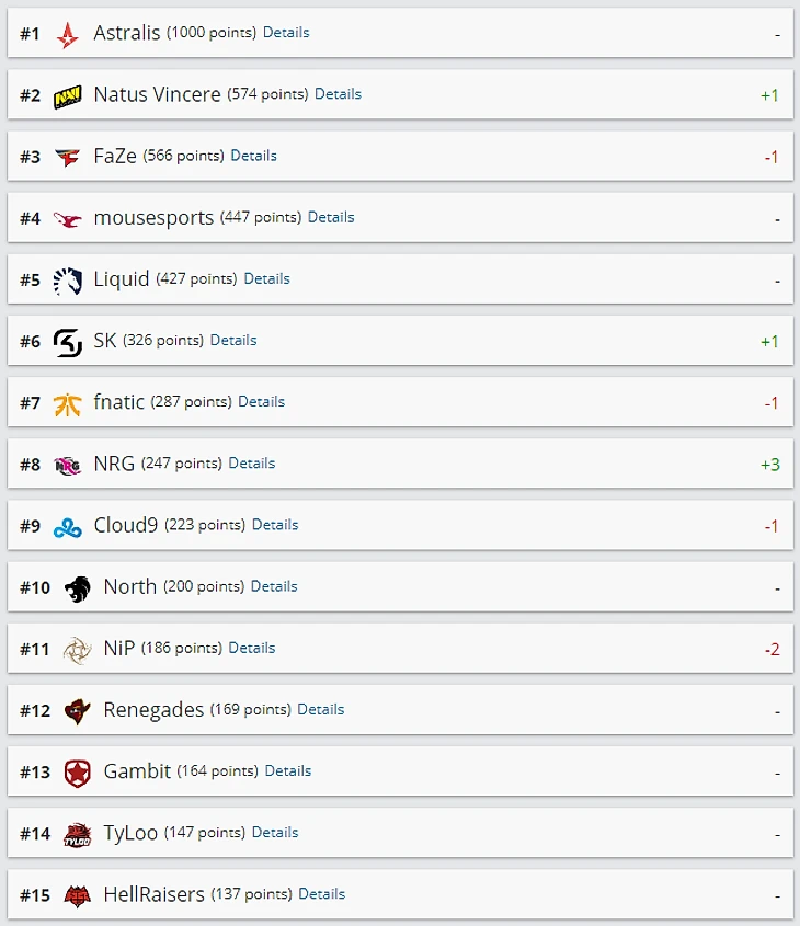 Faze Clan, потерпевшая поражение от Astralis в полуфинале ECS, упала на третье место. Fnatic также ослабила свои позиции в рейтинге и опустилась на седьмую строчку. Ninjas in Pyjamas провели замену с составе, из-за чего упали на 11-е место. На две строчки также опустились Space Soldiers. Сейчас команда находится на 20-м месте.