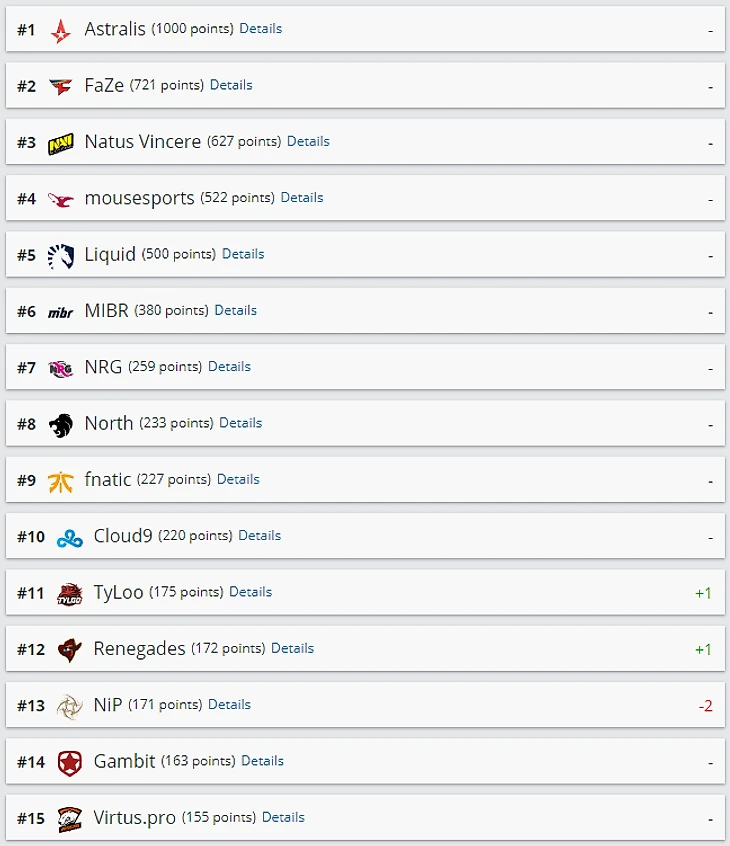 В десятке лучших составов мира изменений не произошло. Tyloo и Renegades поднялись на 11-е и 12-е место соответственно. Optic Gaming и G2 Esports также укрепили свои позиции в рейтинге. Сейчас они находятся на 19-м и 20-м месте соответственно. Team Kinguin поднялась на 13 позиций и теперь располагается на 30-й строчке.