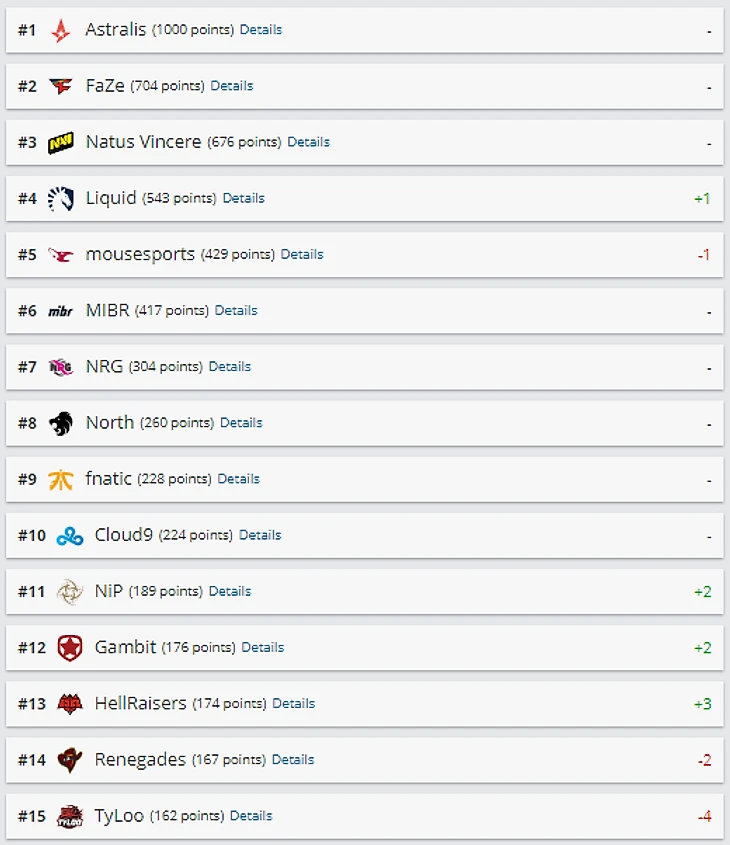 Team Liquid поднялась на одну строчку и теперь занимает четвертое место. NiP и Gambit перешли на две позиции выше. Теперь команды занимают 11-е и 12-е место соответственно. На 13-й строчке находятся Hellraisers, поднявшиеся на три позиции. Team Kinguin продолжила укрепляться в рейтинге и теперь занимает 27-е место. В топ-30 также вернулась Team Spirit. Сейчас команда находится на тридцатом месте.