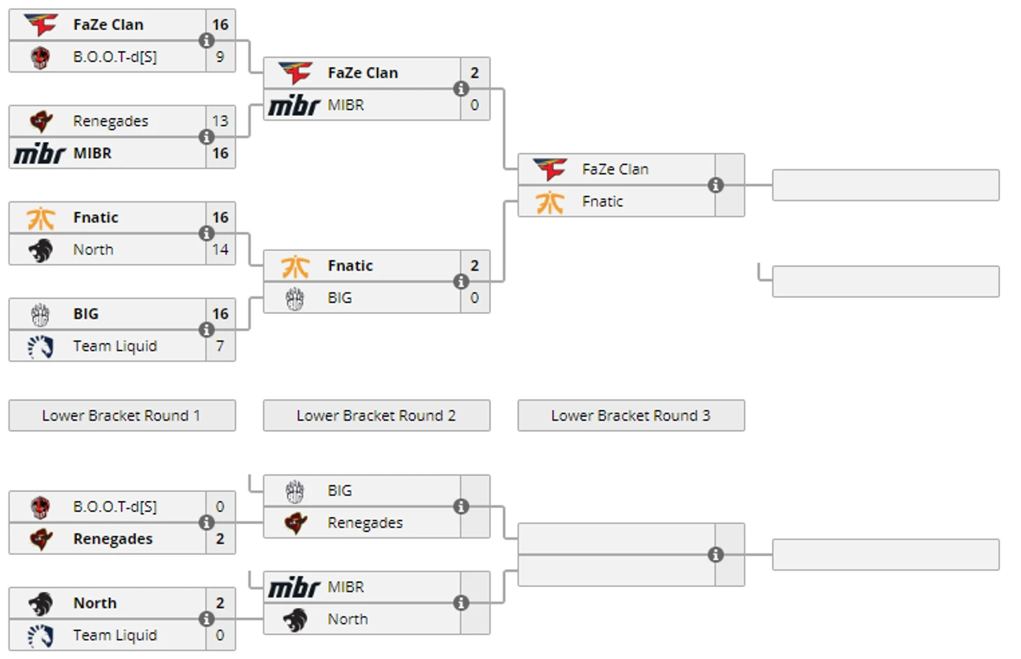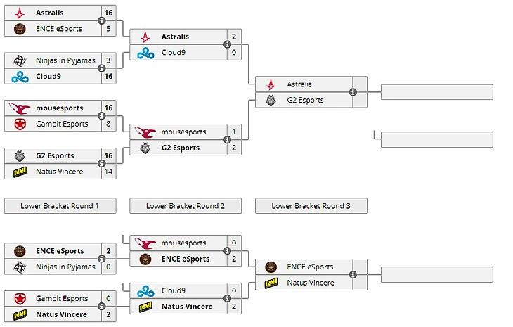 13:00 Renegades 1-2 BIG13:00 MIBR 2-1 North16:30 Ence 1-2 Natus Vincere16:30 Astralis 2-0 G220:00 Faze Clan 2-1 Fnatic20:00 BIG 2-1 MIBR
