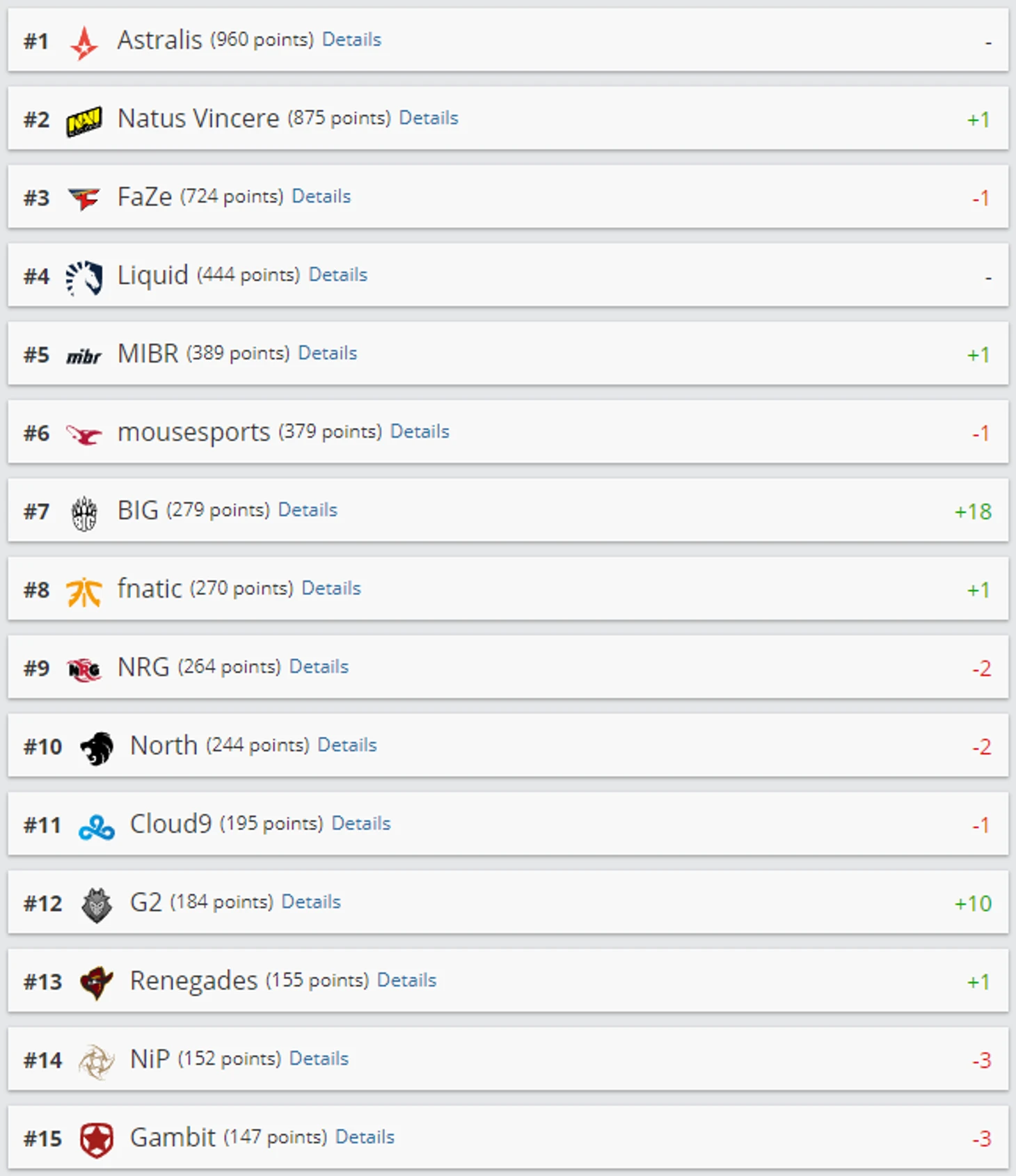 Faze Clan опустилась на третью строчку рейтинга, а Mousesports – на шестую. На две позиции также упали NRG и North. Теперь составы занимают 9-е и 10-е место соответственно. После неудачного выступления на ESL One Cologne NiP опустились на 14-ю строчку, а Gambit – на 15-ю. На 4 позиции упали Hellraisers и Avangar. Сейчас команды находятся на 17-м и 27-м месте соответственно.