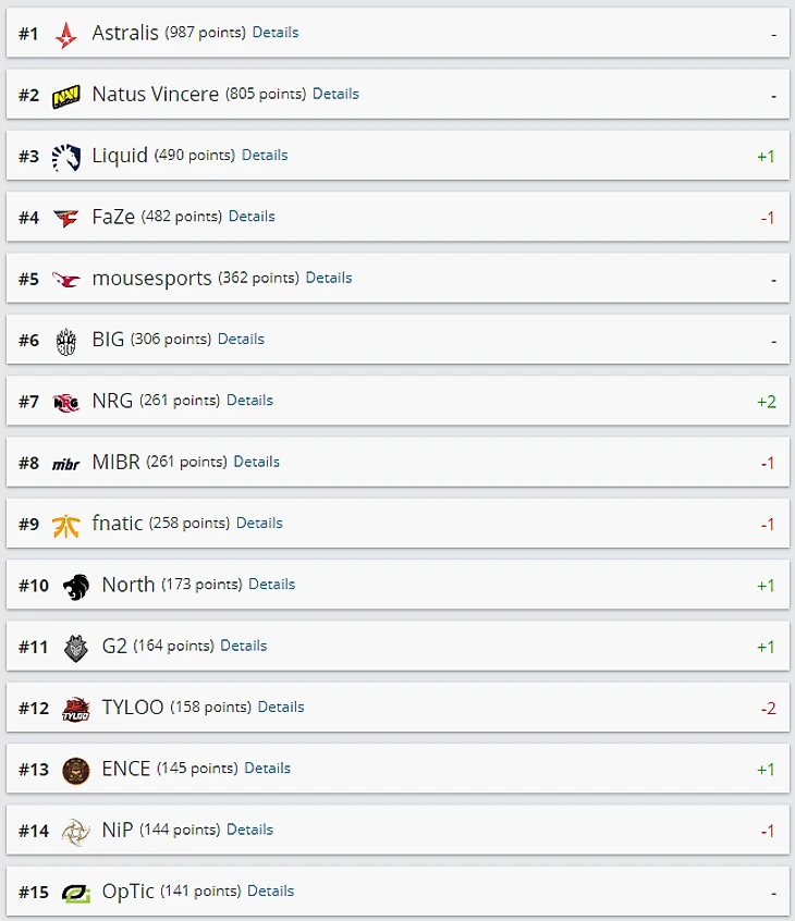 На третье место списка поднялась Team Liquid. На седьмую строчку взлетела NRG, недавно выигравшая IEM Shanghai. На одну позицию в рейтинге поднялись North, G2 и Ence. Теперь они занимают 10-е, 11-е и 13-е место соответственно. На три строчки выше переместилась Complexity, выигравшая квалификацию MSI MGA. Сейчас команда находится на 22-м месте. В топ-30 вернулась AGO, поднявшаяся на две строчки. Теперь польская пятерка занимает 29-е место.