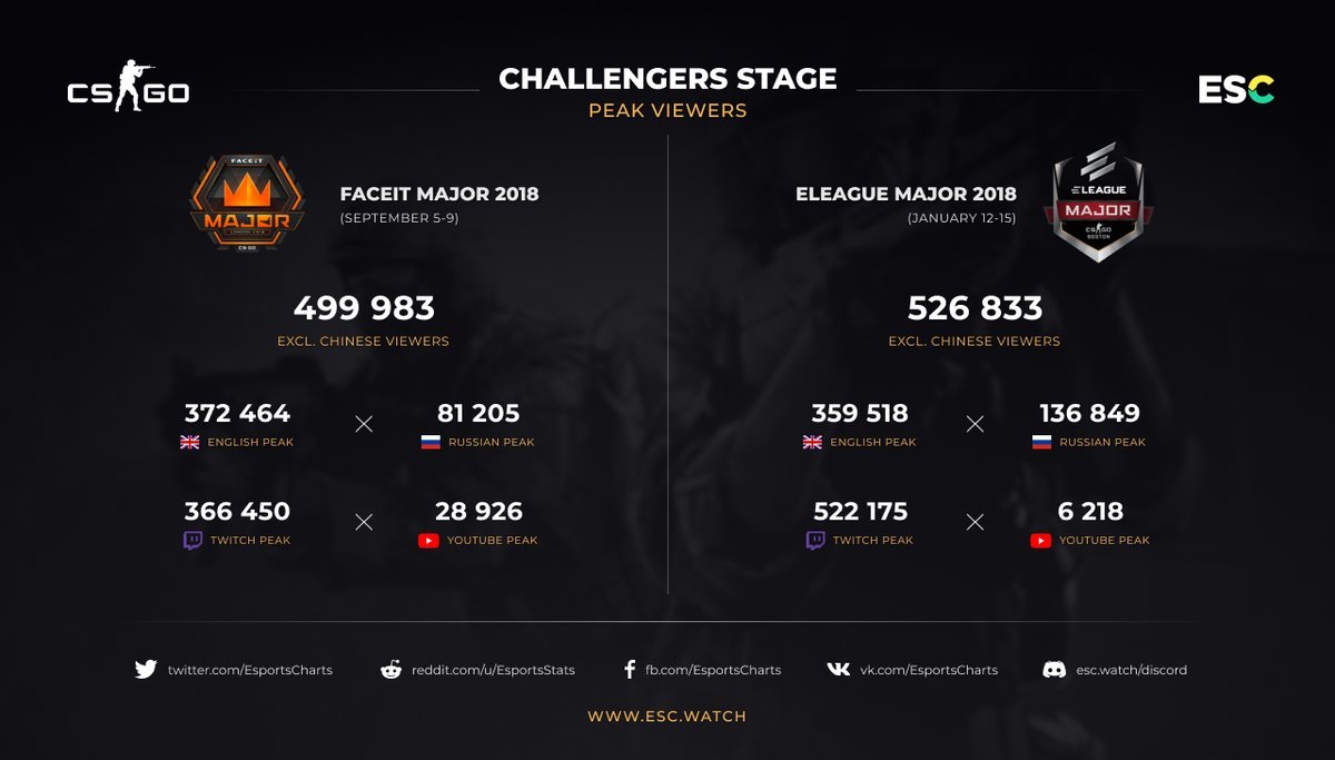 Согласно этим данным, пик зрителей русскоязычных стримов сократился в два раза по сравнению с зимним ELEAGUE Boston Major: со 136 тысяч до 81 тысячи. Общий пик без учета Китая также снизился: с 526 тысяч до 499, при этом пик зрителей англоязычных стримов увеличился с 359 тысяч до 372.