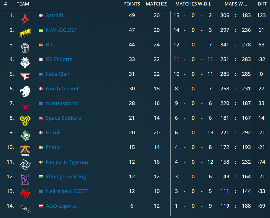18:00 Fnatic – North (Dust2)18:00 Na`Vi – Heroic (Dust2)19:05 North – Fnatic (Train)19:05 Heroic – Na`Vi (Train)20:15 Mousesports – Faze (Inferno)20:15 Windigo – Na`Vi (Overpass)21:20 Faze – Mousesports (Mirage)21:20 Na`Vi – Windigo (Mirage)22:30 Heroic – Mousesports (Train)22:30 BIG – G2 Esports (Dust)23:35 Mousesports – Heroic (Nuke)23:35 G2 Esports – BIG (Cache)